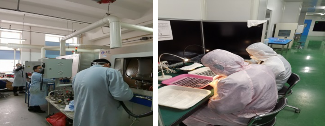2月1日,面對(duì)新型冠狀病毒感染和肺炎疫情加快蔓延的嚴(yán)重形勢(shì),萊茵公司接到了波譜公司和光電公司生產(chǎn)部測(cè)溫儀光窗改型安裝聯(lián)合行動(dòng)的緊急任務(wù)。管理人員和技術(shù)骨干扛起責(zé)任,迅速行動(dòng),示范表率,主動(dòng)請(qǐng)纓投入生產(chǎn)。前后共計(jì)20余人放棄休假,3班24小時(shí)堅(jiān)守崗位,重新摸索工藝方法,改裝設(shè)備夾具,克服光窗封膠鉆孔,數(shù)控磨削改型等多個(gè)困難,無(wú)懼風(fēng)雪低溫,持續(xù)手工浸水作業(yè),確保了每日不少于200件的生產(chǎn),截至 2月8日累計(jì)交付1400余件光窗。值班員工在設(shè)備前凌晨和衣而臥卻毫無(wú)怨言,大家深知每多一個(gè)工件交付,就多一臺(tái)設(shè)備啟用,抗擊疫情的勝利就能加快到來。
