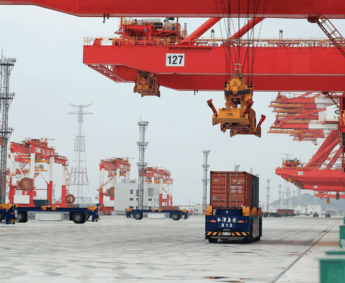 在某國內(nèi)大型物流港口,無人作業(yè)自動(dòng)引導(dǎo)車車循環(huán)往來,超車換道、裝箱卸貨、多車協(xié)同等作業(yè)流暢鏈接……